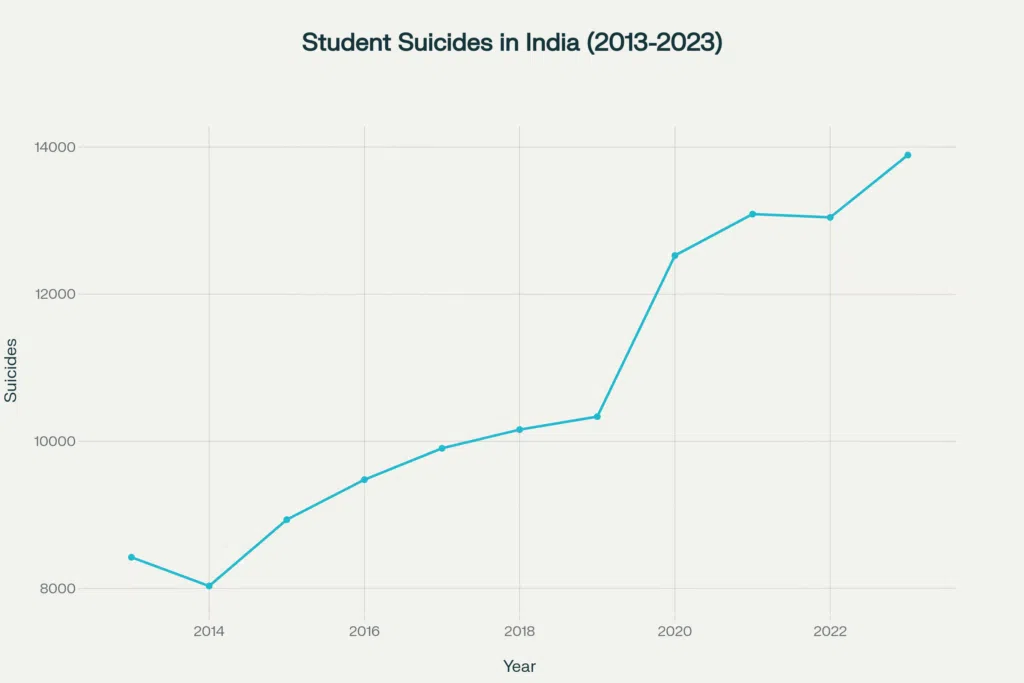 Every hour, a young Indian takes their final breath—not from disease or disaster, but from despair. According to the National Crime Records Bureau, India lost 13,892 students to suicide in 2023 alone. Moreover, this represents a staggering increase of nearly sixty-five percent over the past decade. These aren’t mere statistics on government reports. They are sons and daughters crushed under an education system that murders potential instead of nurturing it.
